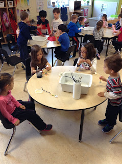 Here there are pipe cleaners with numbers at the top. The students counted the corresponding number of beads and attached them to the pipe cleaners. This is both a good counting activity and a fine motor activity.