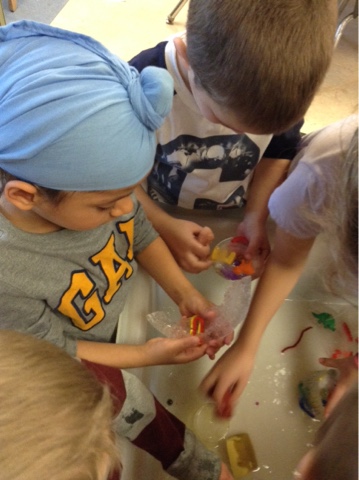 Last week we made predictions about melting ice. Will the ice melt faster if it is in water than if it is not? Will the ice melt faster if it is in little pieces or if it it one big cube? Our interest in melting ice lead us to a new activity this week. We found some containers in the classroom. We filled them with toys, letters and glitter and then poured water over top.